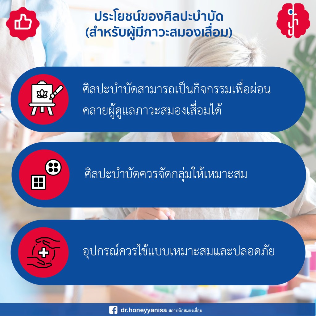โดยได้ร่วมมือกับทางสมาคมนักศิลปะบำบัดแห่งประเทศไทย เพื่อสอนการใช้ศิลปะในการบำบัดและเยียวยาผู้ดูแล เพราะทางผู้ดูแลส่วนใหญ่จะประสบปัญหาเรื่องความเครียดระหว่างการดูแลและความกังวลต่างๆว่าทำได้เต็มที่แล้วหรือไม่ ตามทำนิยามของ ศิลปะบำบัด หมายความว่า การใช้ศิลปะเป็นสื่อเครื่องมือหลักในการเยียวยารักษาอาการเจ็บป่วยทั้งร่างกายและจิตใจ และสามารถค้นหาตัวตนระหว่างการลงมือทำ เสมือนเป็นการบันทึกการเดินทางที่ไม่ได้มีการคาดหวังในระยะเริ่มต้น