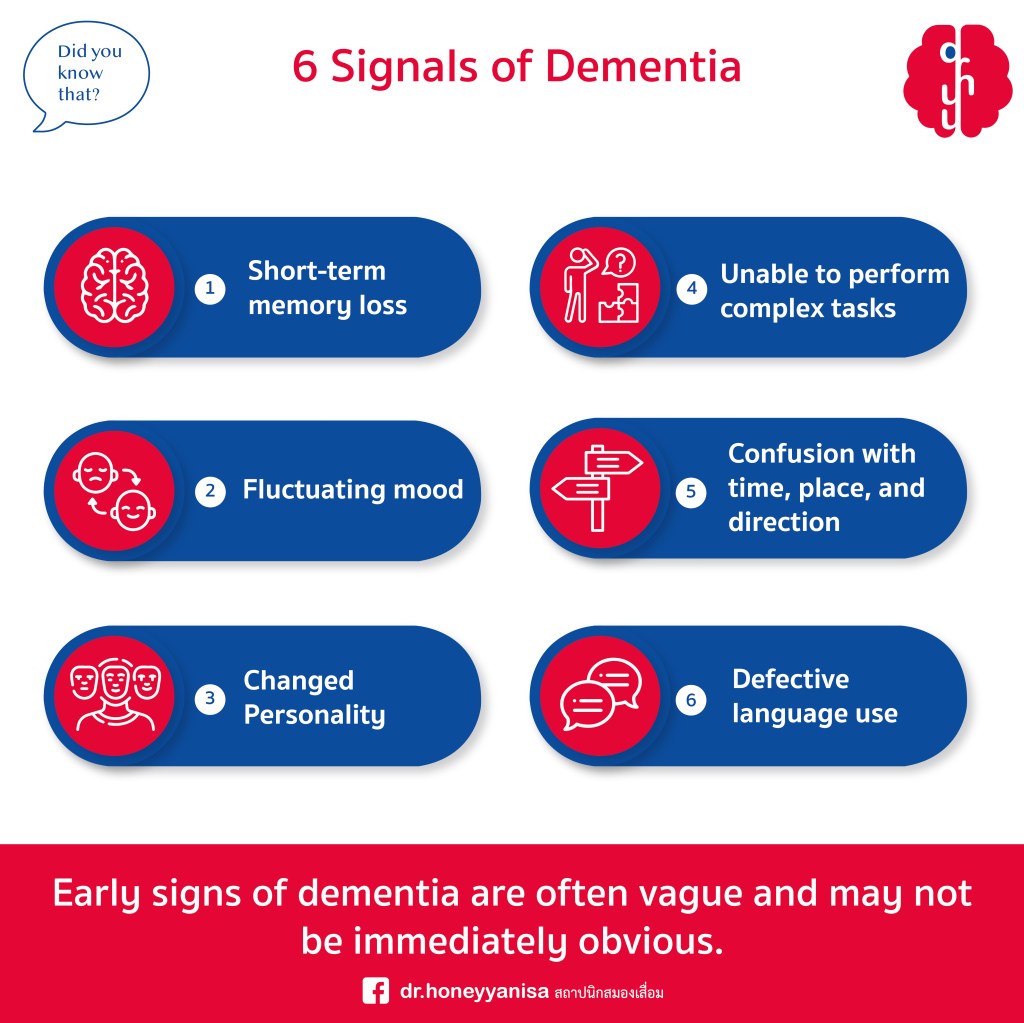 ทั้งนี้แต่ละสัญญาณจะขึ้นอยู่กับแต่ละบุคคล และระยะของภาวะสมองเสื่อม ซึ่งเป็นสิ่งที่จำเป็นอย่างมากที่ต้องได้รับการวินิจฉัยจากแพทย์ผู้เชี่ยวชาญ เพื่อการรักษาและดูแลอย่างถูกต้องและทันท่วงทีค่ะ