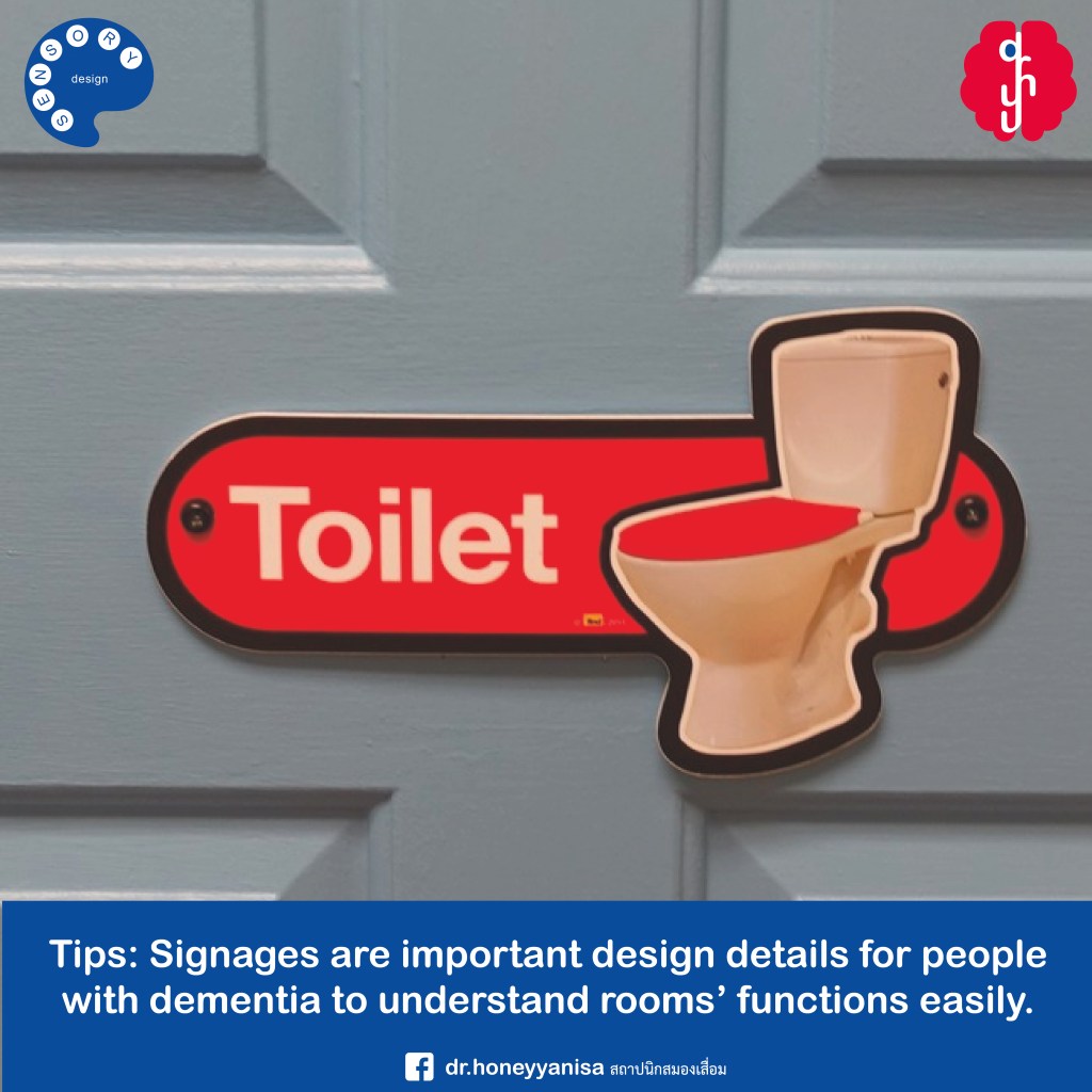 - การออกแบบป้ายควรมีความชัดเจนและเรียบง่ายเพื่อให้บุคคลที่มีภาวะสมองเสื่อมเข้าใจและตีความได้ง่าย ใช้ภาษาที่ชัดเจนและเรียบง่ายพร้อมแบบอักษรขนาดใหญ่ที่อ่านได้ชัดเจน หลีกเลี่ยงการใช้สัญลักษณ์ที่ซับซ้อนหรือเป็นนามธรรมซึ่งอาจทำให้สับสนหรือไม่คุ้นเคย
