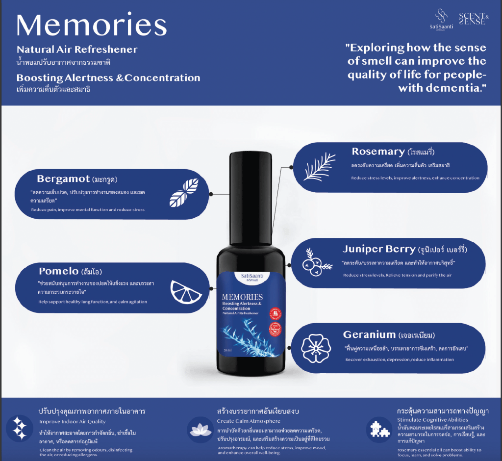 Observations from nursing homes and dementia care facilities highlight the underutilization of olfactory design. Poor ventilation—a common issue in renovated facilities—can negatively impact residents’ and caregivers’ quality of life. Traditional solutions, such as room sprays, only mask odors without leveraging the deeper therapeutic potential of scent. This project seeks to transform dementia care environments by addressing these challenges through improved air quality and the strategic use of natural fragrances. This initiative aims to foster familiar, comforting environments that evoke a homelike atmosphere. Key objectives include enhancing memory recall and emotional connection through olfactory stimulation. Improving overall well-being and daily experiences for individuals with dementia and their caregivers. Addressing poor ventilation by creating health-promoting, pleasant environments with natural scents.